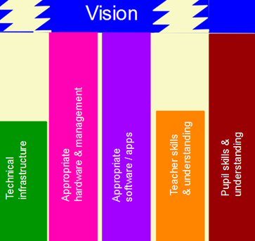 In this school, the Senior Management decided to allow Bring your Own Device. They consulted with parents and governors as part of the vision and they sent out a list to parents of which devices would be appropriate. Pupils arrived in school and proudly displayed the devices (which now could be on their desks instead of in their bags). In fact, 70% had already had devices anyway, so surely it made sense to allow their use. However, the teachers had not really been consulted. Some thought it was a good idea and some didn’t, but there was inconsistent use in lessons. Also, the technical department hadn’t really been consulted properly. The school already had wifi – but not sufficient coverage to manage 1100 new devices. The pupil devices kept losing the internet; pupils played games and messaged each other when they got bored in lessons; parents began to complain. The school felt it couldn’t go back on the decision now it had been made – and ended up with a big ‘salvage’ job, trying to create a proper vision to implement.