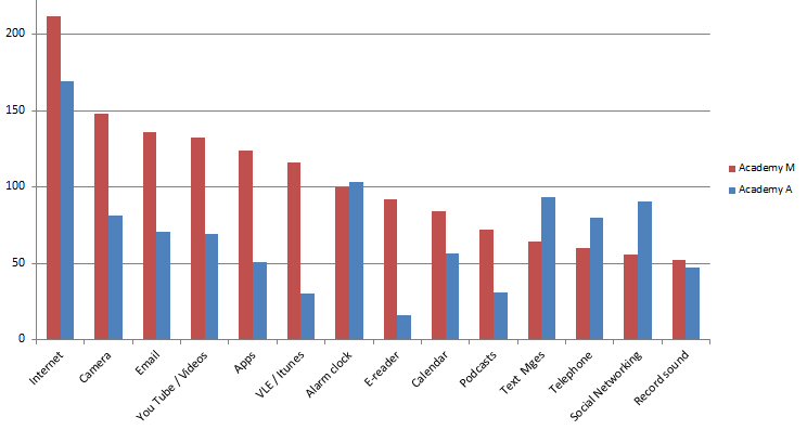 I was researching ‘Pupil perspectives on mobile learning’ and worked with two schools – one where all pupils had a mobile device supplied by the school Academy M) and a second where mobile devices were not allowed (Academy A). I asked all pupils whether they used mobile devices to help with their learning. From those who replied ‘yes’, I went on to ask them (via a questionnaire) which features of their mobile devices they used to support their learning.